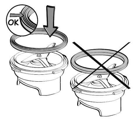 • Należy sprawdzić, czy uszczelnienie znajduje się w prawidłowym położeniu na zespole ostrza. Trzy fałdy uszczelki powinny być widoczne po zamontowaniu uszczelnienia. Jeśli uszczelka została zamontowana odwrotnie, zamocowanie zespołu ostrza do misy będzie niemożliwe.